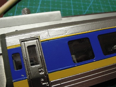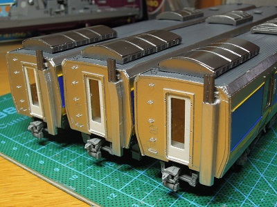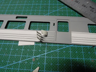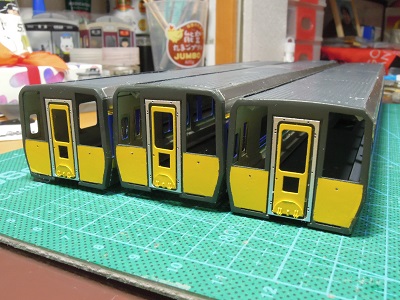 | ・車体組立(2020/2/11〜2020/2/24) 塗装した前面ドアと幌枠を貼り付けます。 |