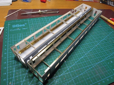 | ・車体箱組(2020/1/17〜2020/1/13) 車体に補強を入れます。 裾はクロスシートを実装するためLアングルを、肩部は 型紙付属の梁を接着します。 接着した梁の上に、屋根板を乗せる構造になっています。 |