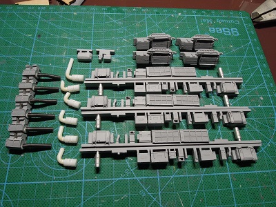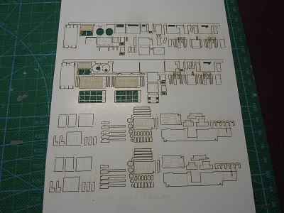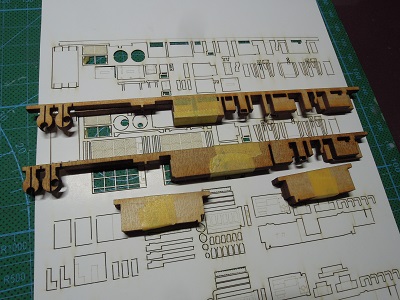 | ・車体箱組(2020/2/1) クーラー類、スカート類の組立を行います。 煙管も型紙パーツが含まれていましたが、上手く組める 自信が無かったので、プラ板で製作しました。 |