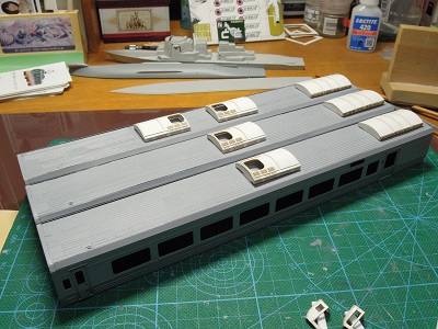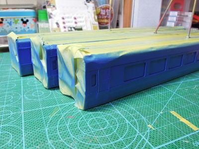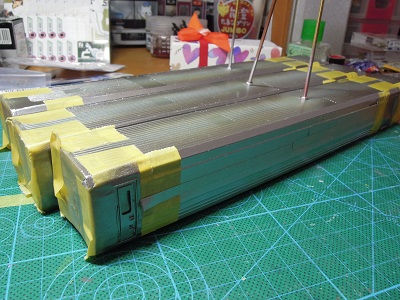 | ・車体箱組(2020/1/14〜2020/1/17) 屋根板を貼りつけ、サフェ吹き→表面処理を繰り返し、 最後#1000のサフェを吹いた仕上げの状態。 |