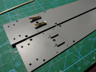 | ・車体組立(2020/3/11) 床板関連にスペーサーを取付け。 これは車体裾絞りによりアングルが傾いているため、 ネジ固定の際に傾きに合わせてプラ板床板が歪むことを 避けるための設けました。 |