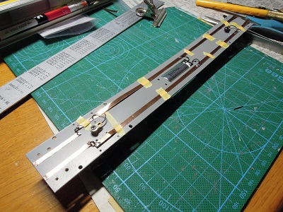 | ・車体組立(2020/2/25) 平行作業で床板関係も進めています。 集電用に銅テープを貼り付けています。 |