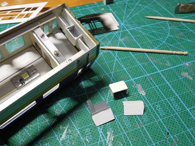 | ・車体組立(2020/4/12) 塗装したシートや喫煙ルーム仕切を実装して、床板を ネジ固定します。 |