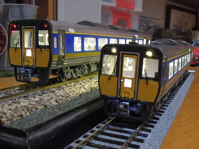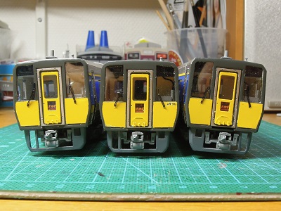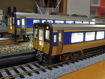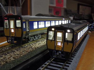 | ・車体組立(2020/4/12) キハ187-1010番代(奥)と1000番代(手前) LED表示器のため、本来は文字だけを浮かび 上がらせたいところです。 |