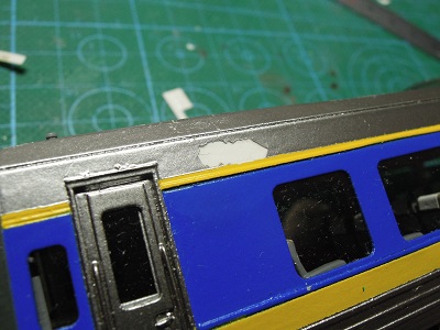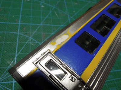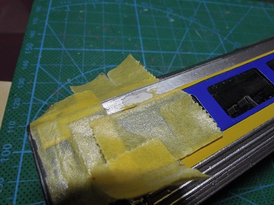 | ・車体組立(2020/4/17〜2020/4/19) 剥がれた周辺をマスキングし、段差が緩やかになる様に ペーパーで削ります。 |