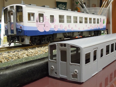 | ・車体組立(2020/5/18〜2020/5/23) 床下側の写真を撮っていませんでした。 動力はエンドウのトラクションモータ使用のため、プラ板に 台車センターピン用穴を開けただけの加工です。 床下機器はカツミのNo.78-00105:新型気動車用Aを使用 しました。 以上で落成です。 最後までご覧いただきありがとうございました。 2023/11/12 |