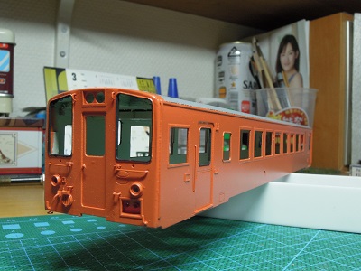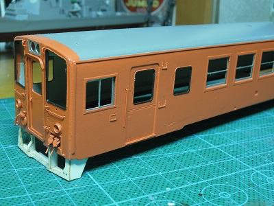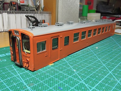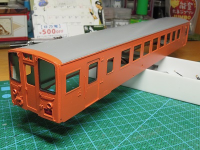 | ・車体塗装(2020/3/15〜2020/3/26) ミッチャクロンを吹いたのち、 @室内アイボリー A車体朱色4号 の順で塗装していきます。 共にGMカラーを使用しています。 |