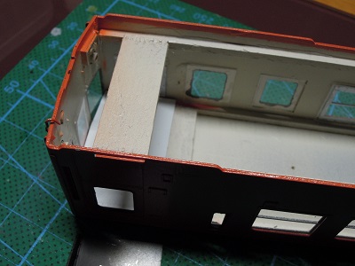 | ・車体組立(2020/5/18〜2020/5/23) クロスシートが市場にあまりない頃でしたので、プラ板 組合わせて、それらしくでっち上げます。 |
