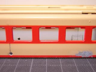 キハ58、キハ28 ・モデルチェンジ車のトイレ窓は正方形でなく、横長タイプゆえ、 一旦埋めた後に再度穴をあけなおします。 |