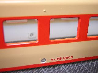 キハ28 ・上記で作った給水口のパ−ツを貼付けた状態です。 窓から、反対側面の給水口が見えていますが、瞬間接着剤で 固定しています。 なお、元々作っていた2両(キハ58-640とキハ28-2409)も全面 塗装し直す為、2409号機も、今回給水口の位置を変更しました。 >後藤所の2183号機あたりに番号変更を考えていましたが、 車番を検討したところ、キハ28のモデルチェンジ車は後藤所 の3022番のみのようです。 キハ28が後藤所ばかりになりますので、鳥取所属車両選択 とすると、やはり給水口位置の変更が必要です(^^;) 今回車番は下記とする予定です。 米トリ:キハ58-1127、キハ28-2409 米トウ:キハ58-652、キハ28-3022 |