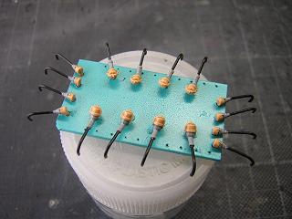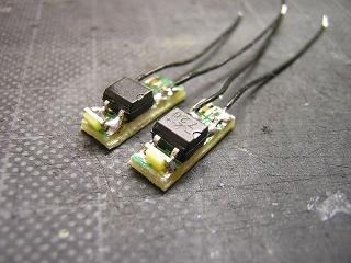ライトユニット改造 ・列車種別幕用に白色LEDを用います。 市販のユニバーサル基板にダイオードブリッジとチップLEDを 実装します。 なお、電流制限抵抗は1.0kΩのチップ品を実装しています。 |