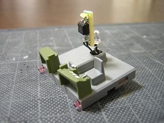 乗務員室塗装 ・乗務員室パーツの色指しを行っておきます。 仕切りについて運転席側は、GSIクレオスNo.303:グリーン FS34102にGM37:白3号を調合したものを、客用ドア側は GM28:西武アイボリーを、天井はGM37:白3号を筆塗りして います。 |