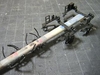 台車塗装 ・台車枠までに分解し、塗装に備えます。 枕張りや、排障器などのパーツはこの際ゴム系接着剤で 固定しています。 |