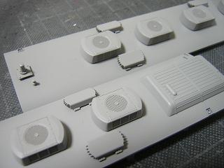 キハ58、キハ28 ・屋根上は、ベンチレータの取付け台座を削り落とします。 この時、穴が開きますので、プラのランナー引伸し棒で埋め、パテで 平滑化します。 キハ58の水タンクは、屋根板と一体モールドとなっていますので、 そっくり切り落とし、t=1.2mmプラ板で塞いでおきます。 '05-2/11 |