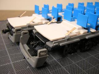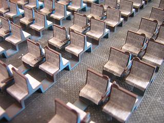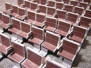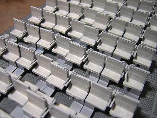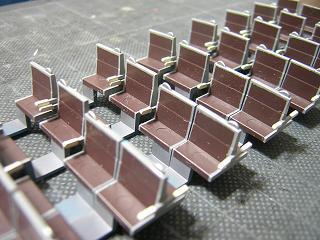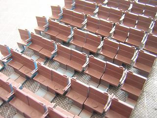 座席塗装 ・マスキング中、何個か肘掛を折ってしまいました。 ということで、プラ板で適当に補修。 |