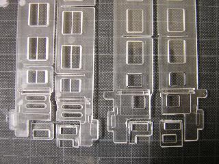 キハ58、キハ28(モデルチェンジ車) ・乗務員室周辺の窓は、キハ58オリジナルでは寸法が合わないので、 キハ65用ガラス窓から切りだし、交換します。 左がキハ65用、右がキハ58/28用です。 乗務員室窓は、両面テープ等で車体と固定します。 |