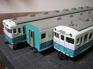 | ・キロハ28−103車体塗装 最後にエメラルドグリーンを吹きます。 写真はマスキングを施した状態。 |
