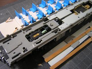 | ・床下組立 M車用の床板にモーター類を組込み、仮組み完了。 座席パーツは別途シート取り付け後、床下ユニットに組み込みます。 |