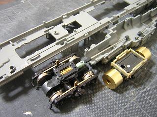 | ・キハ58−7209 動力台車も分解します。 台車と枕ばね部を取り外し、塗装に備えます。 ついでに、導電部(ピポッド)の掃除もしておきます。 |