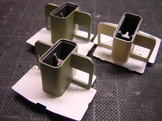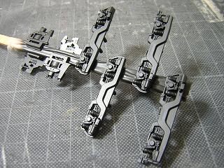 | ・台車塗装 台車枠に艶消し黒を吹き付けます。 作業性から、枕ばねは事前に台車枠に接着しています。 |