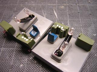 | ・運転室塗装 シート関係とか言っときながら、現実逃避で運転台周りの色差しを しています。 運転台にはGSIクレオスNo.303:グリーンFS34102、シートはGM22: 小田急ブルーを、マスコン類にはGSIクレオスNo.8:銀を、メーター にはGM37:白3号、床にはGM9:ねずみ1号を色差ししています。 |