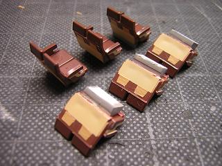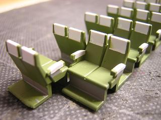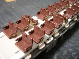 | ・座席塗装 ハ座のシートはシート台座部をマスキングし、モケット部の色を 吹きます。 台座部分はGSIクレオスNo.19:サンディブラウンとGM2:ぶどう2号 を調色したものを吹いています。 |