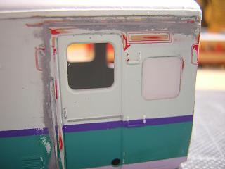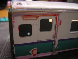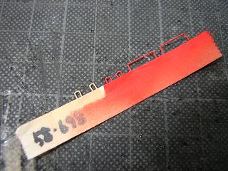 | ・キハ58−698組立 先に下地を拭いた手摺に、車体色を拭きます。 クリームはGM4:国鉄クリーム4号(確か...)、赤はモリタNo.563 :赤11号を使用しています。 |