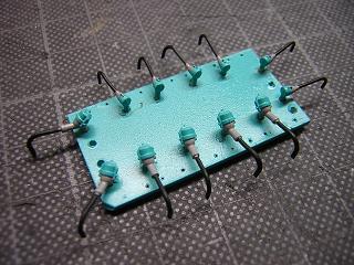 | ・室内灯のLED化 部品を実装した状態。 電流制限抵抗は手持ちの1/2W 680Ωを使用しています。 ダイオードブリッジの+端子は線材でダイオードのアノード側に、 −端子は基板のP側パターンを用いて配線しています。 |