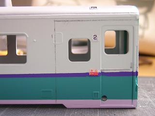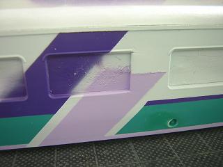 | ・キロハ28−103車体塗装 次に車体裾の薄い紫を塗装します。 同じくGM37:白3号と、GSIクレオスNo.67:紫を調色しています。 写真はマスキングを施した状態。 |