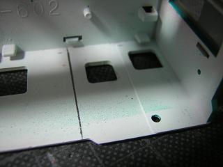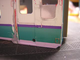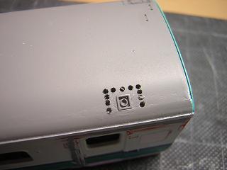 | ・キハ58−7209運転台周り加工 埋めた手摺穴跡を軽く整形しておきます。 また、元のワイパー穴周りは瞬間接着剤のはみ出し跡があったので、 軽くペーパーで整えておきます。 |