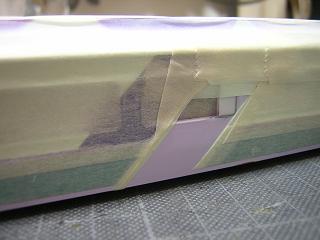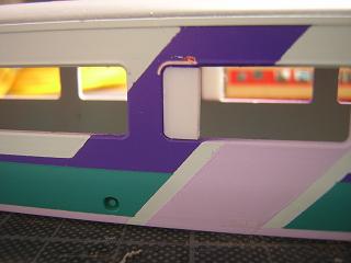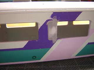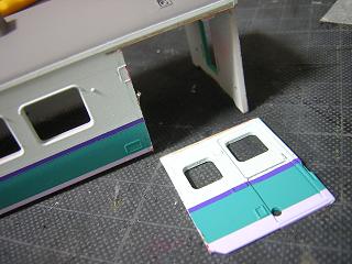 | ・キロハ28−103車体加工 実車は、半室普通車に改造した為、壁を設けた為普通車側の窓が 小さくなっています。 模型でもプラ板で埋めて再現します。 写真はA〜C位側。 |