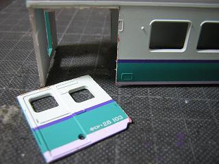 | ・キロハ28−103車体加工 切断した側面を貼り付けます。 写真はC位側。 |