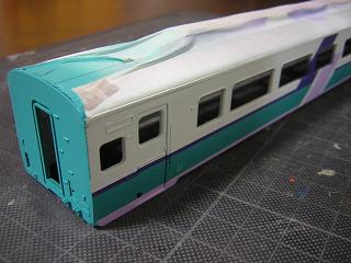 | ・キロハ28−103車体塗装 写真はマスキングを施した状態。 |