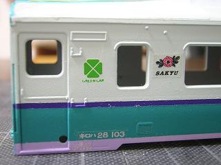 | ・キロハ28−103車体塗装 仕上げの半光沢を吹く前に、一旦落としたグリーンマークのインレタや、 エンブレム、車番などのデカールを貼り付けておきます。 |