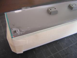 | ・キロハ28−103窓ガラスパーツ加工 グリーン室と普通室の仕切り壁設置の為、普通席側の窓が小さく なっています。 こちらも現物あわせで窓ガラスパーツを削っておきます。 |