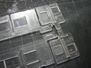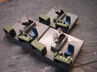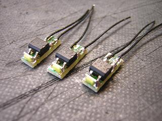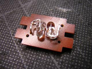 | ・室内灯のLED化 LEDの実装。 KATOの場合、車両中央にライトユニットを配置し、両側の 導光材を照らす構造 ゆえ、LEDを写真のように配置しています。 |