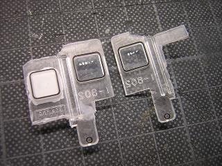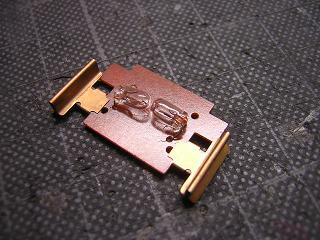 | ・ライトユニットの改造 再び車体を分解し、ライトユニットを取り外します。 列車種別幕用の電球(手前の長い方)を基板から外します。 |