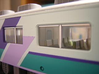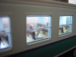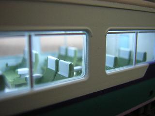 | ・座席塗装 ハ座リクライニングシート背面のテーブルを再現します。 手軽さから、マスキングテープに塗料を吹きつけた後、 適当な大きさにカットして 貼付けています。 なお、テーブルはGSIクレオス:サンディブラウンを使用しています。 あと肘掛下も、実車の写真を見て適当に色を入れています。 (手塗りの為、ばらばらでかえって見苦しくなったかと) |