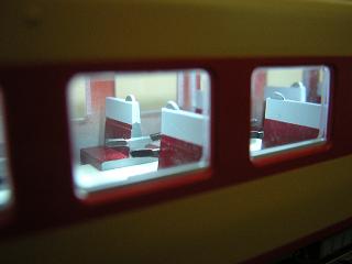 | ・座席塗装 キハ58-698のシートも同様です。 シートモケットはGSIクレオスNo.3:赤とGM29:京急バーミリオンを 調色しています。 (少量のGM32:阪急マルーンかGM2:ぶどう2号あたりも入れたかも しれません。) |