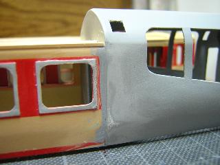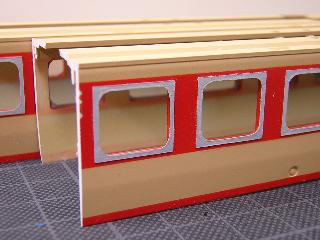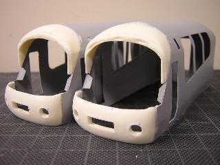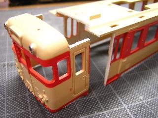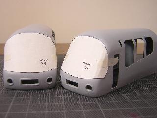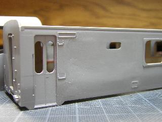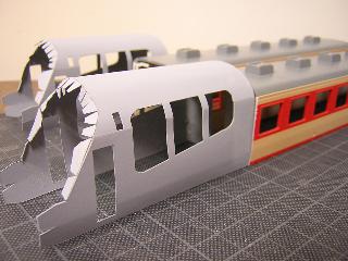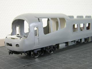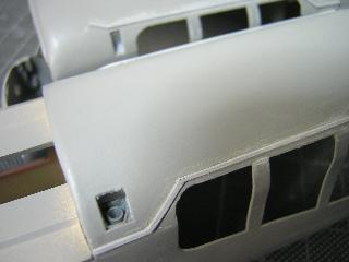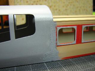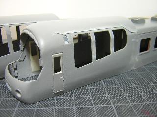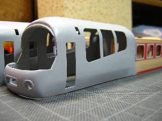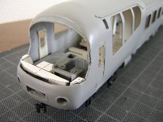・切断面を、目の細かいヤスリで整え、前頭部と合わせていきます。 後部客室との接合は、段が発生するため、パテ等で成形する ことになると思われます。 つづく 2005-4-10 |