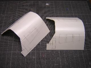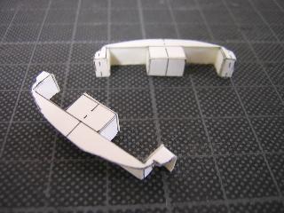 ・次の手は手軽にペーパ-で試作。 手持ちのケント紙から切出してみます。 紙の目を逆にした為、屋根のRがうまく出ませんが、前部のおでこと あごをプラで構成すれば、形になりそうな感触です。 >プラと紙の相性に不安が残りますが...。 ということで、この方式で量産試作へ。 |