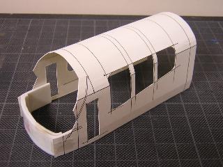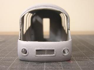 ・前面窓ガラス型取りのため、ペーパで試作。 前面窓は塩ビ板か何かで実現出来そうな感触です。 2005-5-8 |