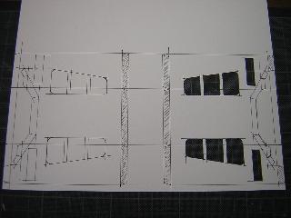 ・ケント紙に0.3mmのサインペンを使ってケガいていきます。 半分は既に窓を抜いています。 窓ヌキは、丸刃の彫刻刀を持ち合わせていませんので、 デザインカッターで行って います。 |