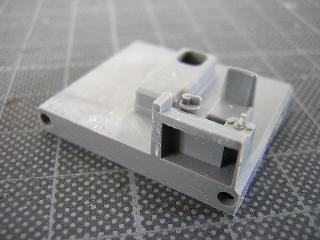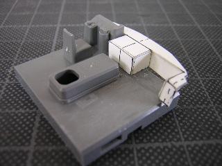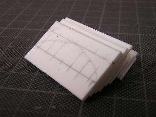 ・サーフェイサーを吹いた後、切出していきます。 4隅のRは、工具が入手出来なかった事から、デザインカッターを 使用していますが、かなり不揃いとなりました。 丸刃の彫刻等で切出したいところです。 |