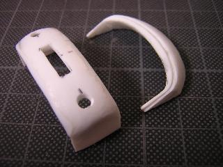 ・おでこ部とあご(ライト&愛称幕まわり)部のパーツを成形した状態。 おでこ部は上記パーツを削るのみ(^^;)です。 >段になっているところが、全面ガラスとの”のりしろ”です。 あご部は、コの字型に曲げたt=1.2mmのプラ板を2枚重ね、 Rがつくように削っていきます。 その後、ライト、愛称幕用の穴を開けます。 まずは下処理としてライトはφ3mmで、愛称幕は11.5×3mmと しています。 |