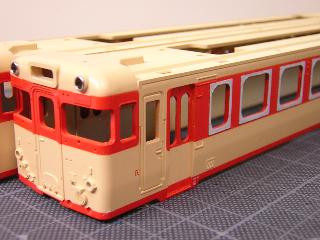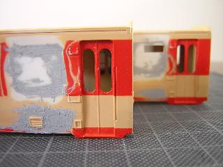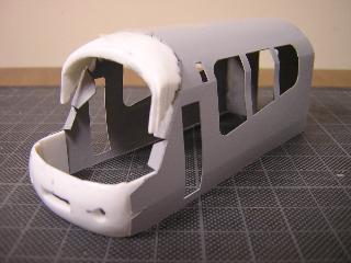 ・展望室と、種車ボディを接合部を整えていきます。 展望室側が、やや幅広だった為、パテを盛り心持ち展望室側を 削っていきます。 最終的にはグレーを吹いて全体のバランスを確認する予定です。 |