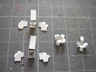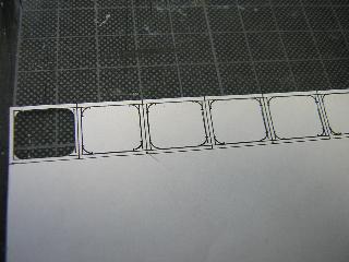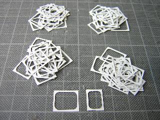 ・エーデル鳥取用700番台は、客用窓周りに種車のユニット サッシの名残があります。 また4隅のRが大きくなっている事から、窓枠の新製が必要に なります。 窓枠はプリンタ用平滑紙を使用しました。 実現にはt=0.2mmプラ板使用や、一旦窓埋め後に再度開直す 等の手法が考えられましたが、量産(66個)を考慮すると、上記 手法が手軽と判断しました。 |