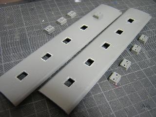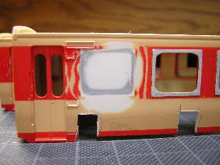 ・改造の際、実車には一部トイレが増設されています。 その為キハ65-701、1701はBC位側の客用窓が2個、 キハ65-711で1個が埋められていますので、t=1.2mmのプラ板で 窓を一旦埋めた後、トイレ窓を開け直します。 '05-6/5 |