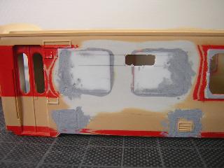 ・キハ65-701 トイレまわりです。 若干窓埋め部に段差が見えますので、再度パテ盛り→削りを 繰り返していきます。 '05-6-19 |