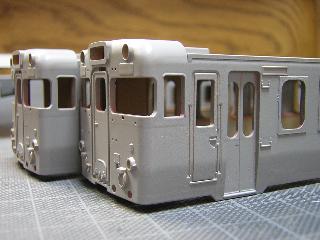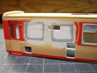 ・窓枠貼付け 中間車(711/1711)も同様に貼付けます。 数が多いので、1日作業となりました。 硬化後、ペーパ-等で表面や形を整えていきます。 2005-5-6 |